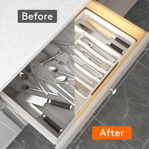 U HOOME - منظم أدراج أدوات المطبخ الفضية، صينية أدوات مائدة قابلة للتوسيع لتنظيم أدراج أدوات المائدة الفضية، صينية أدوات مائدة قابلة للتعديل من يوم هووم، فواصل تخزين بلاستيكية للملاعق والشوك والسكاكين (أبيض)