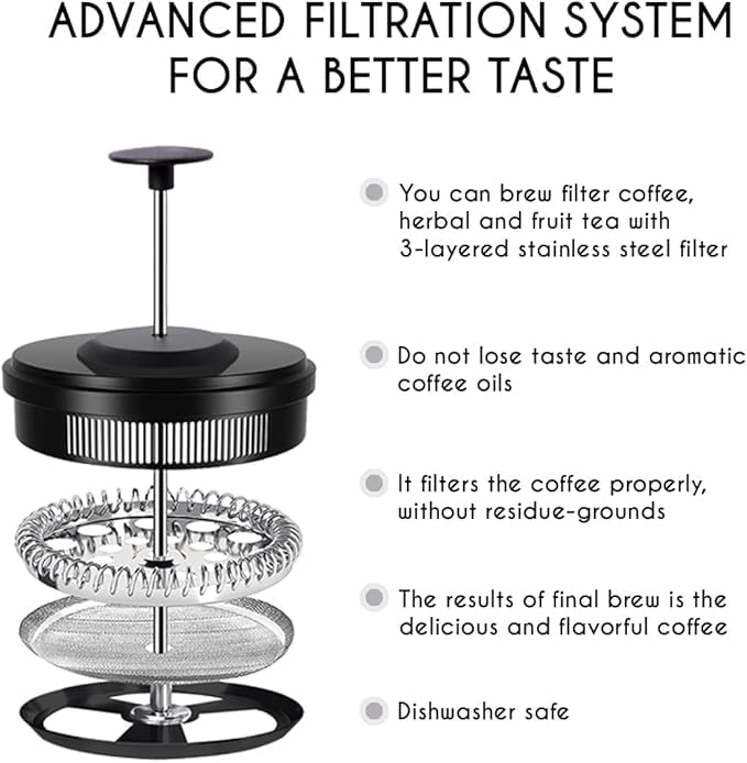- نظام تصفية متطور: فلتر من الستانلس ستيل متعدد الطبقات يضمن تصفية مثالية للقهوة دون ترك رواسب