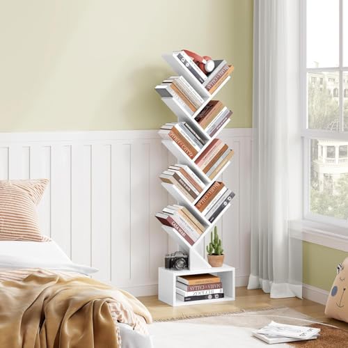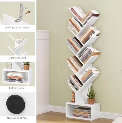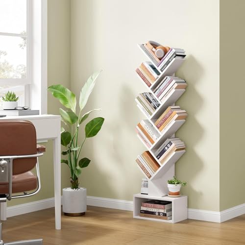 Uand home - رف كتب بتصميم شجرة من 10 طبقات من يواندهوم، خزانة كتب خشبية صغيرة مع خزانة تخزين، خزانة كتب عصرية طويلة ضيقة للاقراص المضغوطة/الافلام/الكتب، ارفف منظمة للكتب للمنزل والمكتب وغرفة المعيشة وغرفة النوم