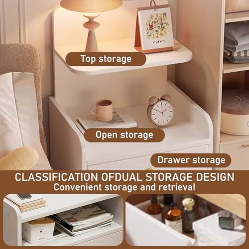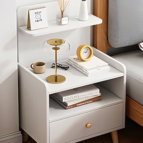 Uandhome - طاولة بجانب السرير مع ارفف منزلقة مفتوحة من يواندهوم، طاولة جانبية من الخشب الصلب مع ادراج، طاولات جانبية عصرية لغرفة النوم والزاوية الصغيرة بجانب السرير وادراج ضيقة واثاث لغرفة النوم (ابيض)