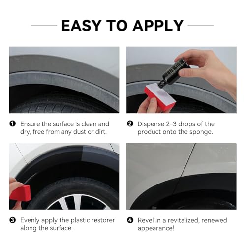 - 【سهل الاستخدام】استخدام مُرمم تجديد الأجزاء البلاستيك الخاص بنا سريع وبدون مجهود. ببساطة نظف السطح، ضع كمية صغيرة من المُرمم باستخدام قطعة قماش ناعمة أو إسفنجة وافركه بلطف. شاهد كيف يتم امتصاص المنتج بسهولة في البلاستيك، مستعيدًا لونه ولمعانه.
