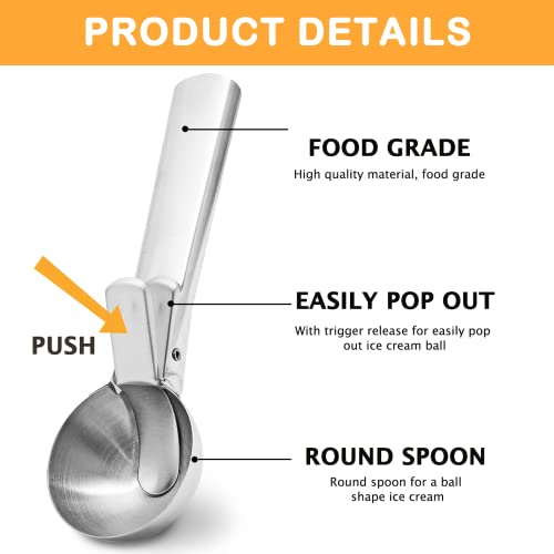 - تصميم على شكل كرة -- تصميم رأس ملعقة كروية مع مقبض ضغط، يسهل الحصول على شكل كرة آيس كريم مثالي. ثم اضغط على المقبض لأسفل حتى يتمكن من إخراج الآيس كريم دون أي جهد.