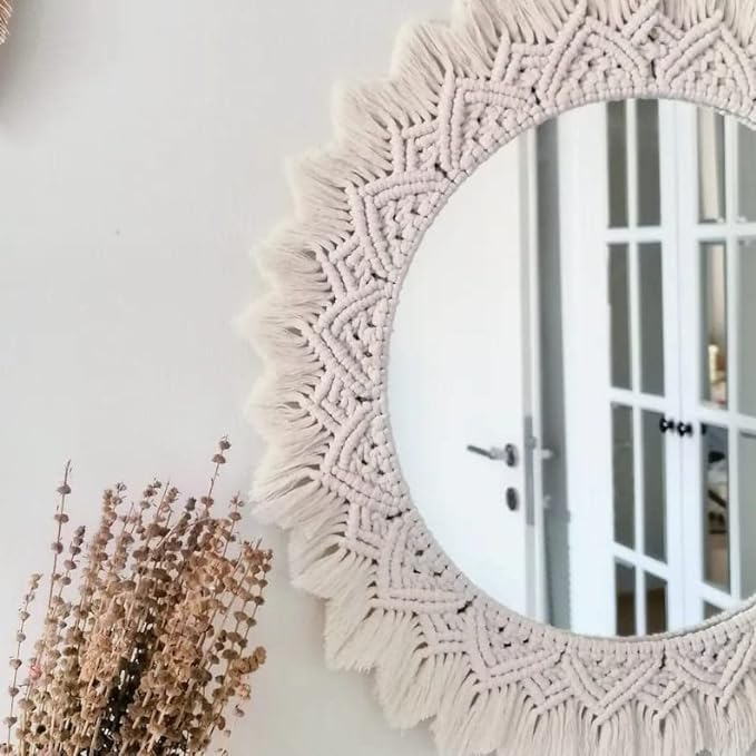 - المادة: مرآة مكرمية للتعليق على الحائط مصنوعة يدويًا باستخدام مكرمية قطنية 3 ملم ذات جودة عالية ومرآة دائرية 3 ملم.