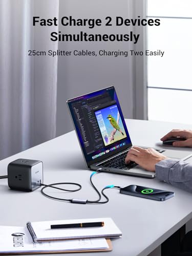 - كابل مقسم 2 في 1 شكل حرف Y: مجهز بتقنية الشحن السريع بي دي جهازين USB-C في وقت واحد مع كابلين مقسمين مقاس 25 سم. مع طاقة قصوى تبلغ 65 واط و30 واط على التوالي، يمكنك شحن اللاب توب والأجهزة المحمولة في نفس الوقت. (لا يدعم نقل البيانات وإخراج الفيديو).