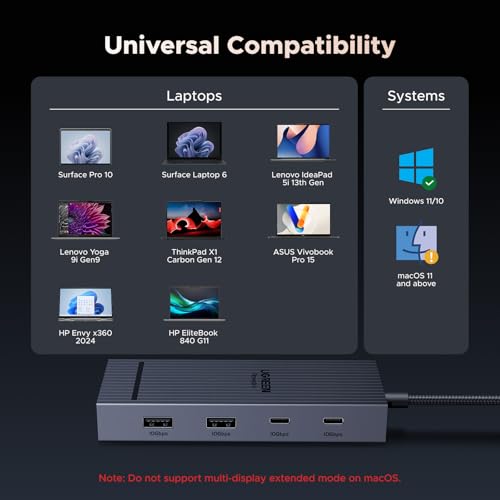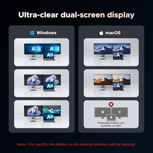 - شاشة مزدوجة بدقة 4K وتردد 60Hz للاستخدام متعدد المنصات: تمتع بسهولة إعدادات الشاشة المزدوجة، سواء على نظام ويندوز مع شاشة موسعة أو على نظام ماك مع شاشة عاكسة، كلاهما يدعم دقة تصل إلى 4K بمعدل تحديث 60Hz. قاعدة توصيل USB نوع سي رائعة لتعدد المهام، والأعمال الإبداعية، والألعاب، أو استهلاك الوسائط، حيث توفر جودة صورة رائعة وتعزز الإنتاجية في أي مجال. ملاحظة: يرجى التأكد من أن اللاب توب لديك يدعم توصيل طاقة 1.4. (تتوافق مع الإصدارات السابقة بدقة 2560 × 1440 بمعدل تحديث 120Hz و1080P بمعدل تحديث 120Hz)