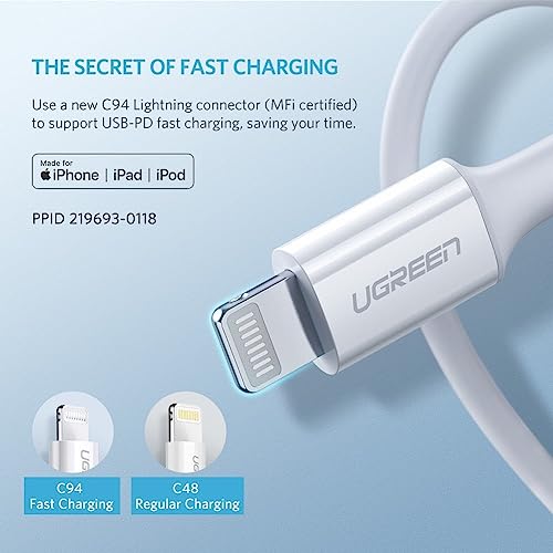 - معتمد من ابل: يتميز بوصلة C94 الجديد وشريحة معتمدة من ابل، يوفر كابل لايتنينج إلى USB-C من يو جرين حماية مزدوجة لموبايل ايفون أو الايباد الخاص بك. لا توجد رسالة تحذيرية تزعجك، فقط قم بتوصيله ثم ابدأ العمل بدون قلق.
