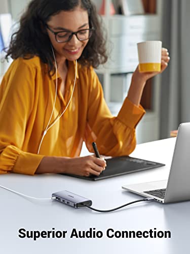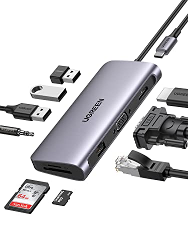 - موزع USB نوع سي 10 في 1: محول متعدد المنافذ من يوجرين من النوع سي، يأتي مع منفذ HDMI 4K ومنفذ في جي ايه تقنية FHD، منفذ جيجابت ايثرنت و3 منافذ USB 3.0 إضافية، فتحات بطاقة اس دي/تي اف ومنفذ للشحن وتوصيل الطاقة USB نوع سي 100 وات، مع منفذ صوت 3.5 ملم، يساعد موزع USB نوع سي الكل في واحد على استعادة كل المنافذ والوصلات.