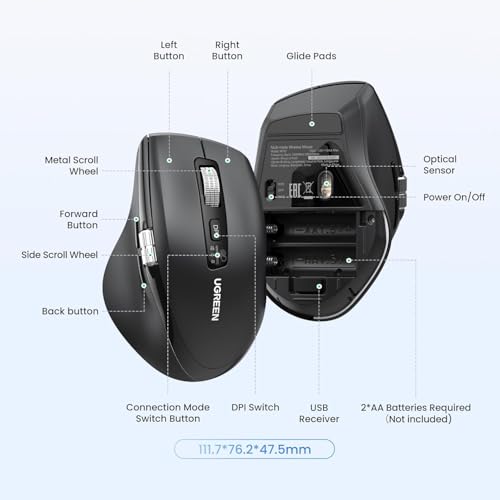 - وضع مزدوج: يعتمد الماوس اللاسلكي من يوجرين على طرق اتصال بتردد 2.4 جيجا والبلوتوث. اضغط لفترة قصيرة على زر إعداد الوضع للتبديل ويمكن توصيله بـ 3 أجهزة في نفس الوقت. لا يلزم تثبيت برنامج تعريف لتحقيق اتصال مستقر بالجهاز، على بعد 10 أمتار. ملاحظة: يتم تخزين مستقبل USB في الجزء السفلي من الماوس). يتطلب ماوس البلوتوث اللاسلكي بطاريتين ايه ايه 1.5 فولت (غير متضمنة في العبوة).