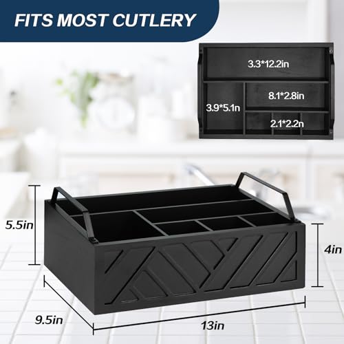 Ukonvi - موزع وحامل للاطباق الورقية لطاولة المطبخ، علبة ادوات المائدة الفضية الخشبية الريفية، صندوق منظم ادوات المائدة للاكواب والملاعق والشوك والمناديل، اكسسوارات المطبخ (اسود)