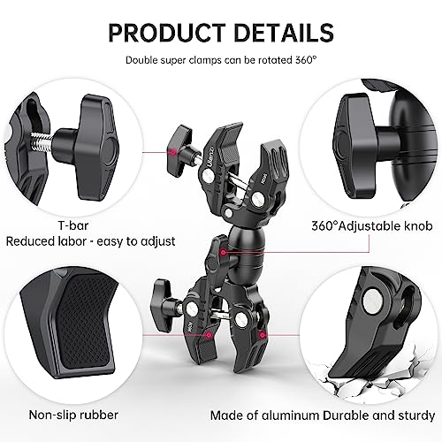 - 【رأس كروي مزدوج دوار 360 درجة】: يمكن تعديل المشبك مزدوج الرأس للذراع السحري 360 درجة. مع ثلاثة قضبان على شكل حرف T، يمكنك ضبط موضع المشبك بحرية عن طريق ضبط الزر. الحد الأقصى لسعة الحمل هو 3.3 باوند..