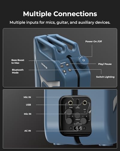 - مدخلات الميكروفونات المزدوجة/الجيتار والتحكم في التطبيق: قم بتوصيل الجيتار أو الميكروفونات السلكية، أو قم بتوصيل الميكروفونات اللاسلكية للاختناقات الحية أو ليالي الكاريوكي. اتصال لاسلكي منخفض للغاية يسمح بالغناء الفوري! تسمح المقابض المستقلة لمستوى الصوت والصدى والميكروفون بالتحكم الكامل في صوتك، سواء كنت تؤدي أو تتدرب أو تستضيف. استخدم تطبيق التيميا لتبديل أوضاع الصوت، وتخصيص تأثيرات الإضاءة، وضبط معادل الصوت الخاص بك، والحفاظ على تجربتك الصوتية محدثة مع تحديثات OTA العادية.
