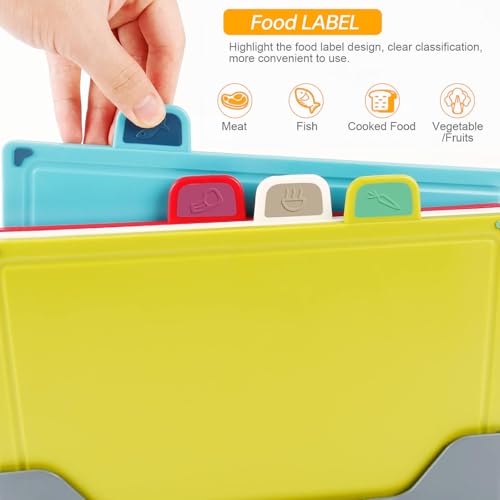 - 【تصنيف الألوان】مجموعة من 4 ألواح تقطيع بلاستيكية مرمزة بالألوان مع علبة تخزين بلاستيكية. كل لوح تقطيع له رموز وألوان مختلفة، مما يسمح لك بتحديد نوع الطعام المناسب لكل لوح تقطيع بسرعة.