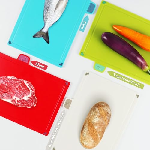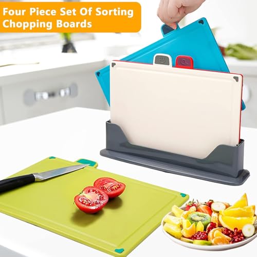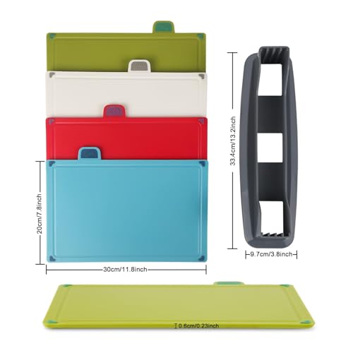 UltiUnison - مجموعة مكونة من 4 ألواح تقطيع مع حامل تصريف ومقبض للإمساك، لوح تقطيع بلاستيك غير قابل للانزلاق للحوم والخضروات والفواكه والأسماك من التييونيسون (20 × 30 سم - 4 قطع)