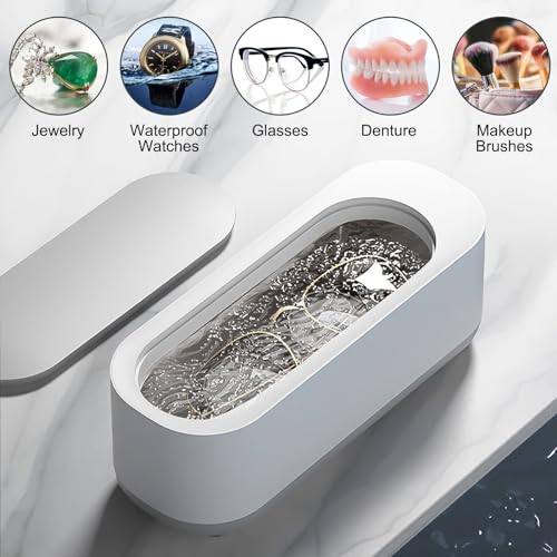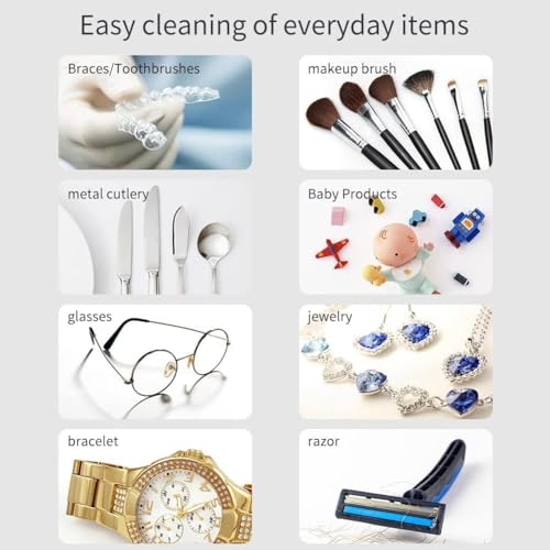 - ✅ يمكن لآلة تنظيف المجوهرات سونيك تنظيف العديد من العناصر مثل الساعات المقاومة للماء والنظارات ومعظم المجوهرات وأطقم الأسنان وماكينة الحلاقة المقاومة للماء وشفرة الحلاقة وفرش المكياج.