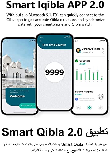 - 【5 تذكيرات بوقت الصلاة】مع البلوتوث المدمج، يمكن توصيل خاتم F01 بسهولة بتطبيق iQibla. يمكنك تلقي تذكير بـ 5 أوقات الصلاة من خلال خاتم F01.