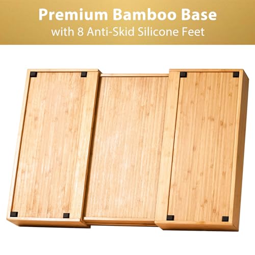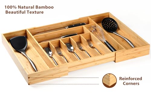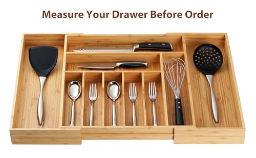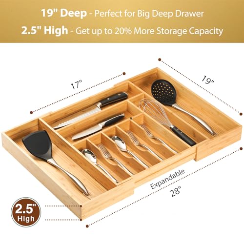 Umilife - اميليف منظم ادراج ادوات المطبخ كبير جدا قابل للتوسيع وعمق 19 انش للادراج الكبيرة مقسم من خشب الخيزران للتعديل مع اخاديد منحنية حامل تناول الطعام