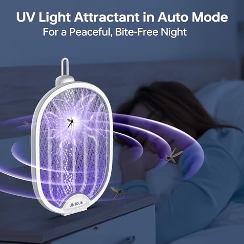 UN1QUE - مضرب ناموس 2 في 1 قابل للطي وإعادة الشحن من يونيك، صاعق ذباب كهربائي ببطارية تدوم طويلًا 1200 ميللي امبير في الساعة، أبيض