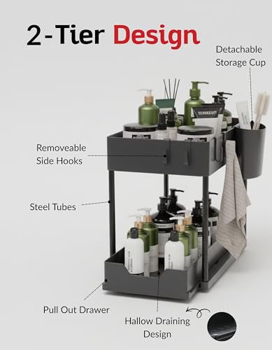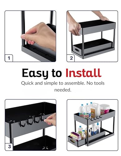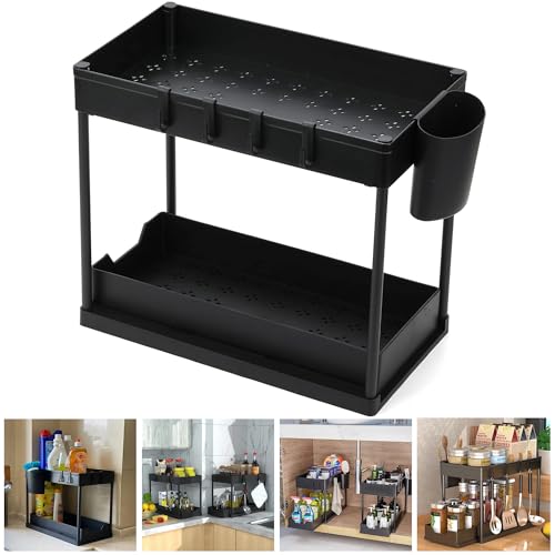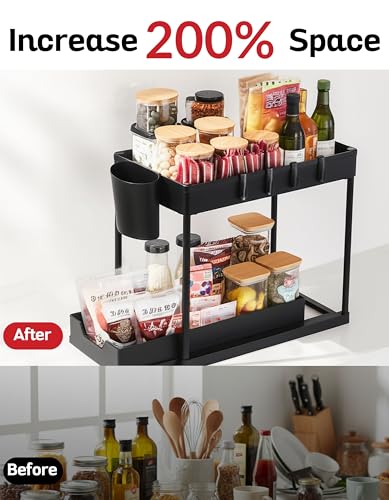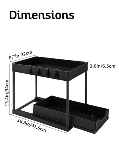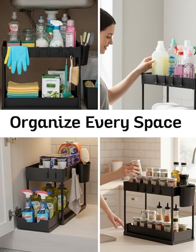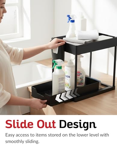 - زيادة مساحة التخزين - ينظم الدواليب تحت الحوض لتحسين استخدام المساحة مع توفير مساحات منظمة بدقة مع هذا المنظم المكون من طبقتين تحت الحوض. مثالي للمطابخ أو الحمامات أو غرفة المؤن أو غرف الغسيل، حيث إن سلال التخزين المنزلقة تجعل من السهل الوصول إلى مستلزمات التنظيف وأدوات النظافة والتوابل وأكثر من ذلك. يزيد من مساحة الخزانة الرأسية بتصميم من طبقتين.