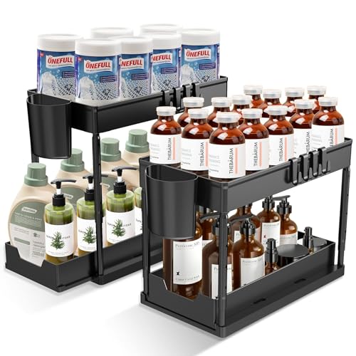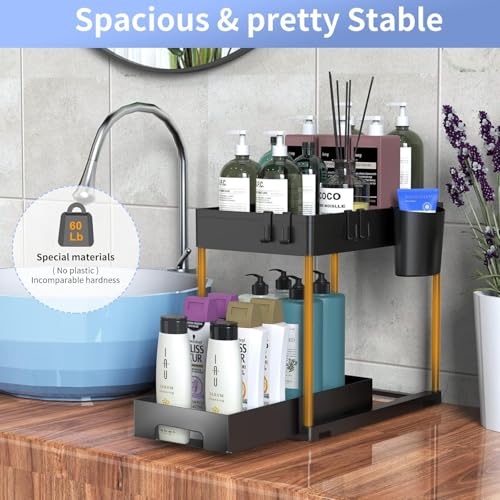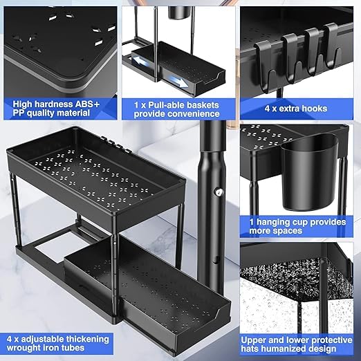 Happy Home - منظمات تخزين تحت الحوض من طبقتين بارتفاع قابل للتعديل ومنظم للمطبخ مع أدراج منزلقة، 2 كوب تعليق و8 خطافات، منظم حمام تحت الحوض، أسود