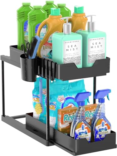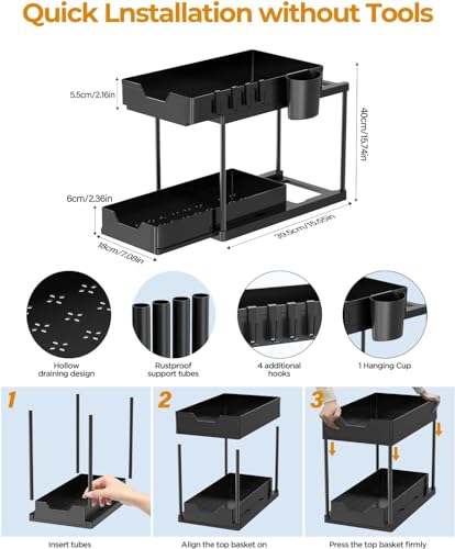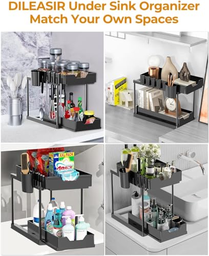 DILEASIR - منظمات تحت الحوض ومنظم حمام للتخزين، منظم سلة خزانة المطبخ المنزلق بطبقتين مع خطافات، كوب تعليق، فواصل مقابض، منظم رفوف تحت الحوض متعدد الاغراض