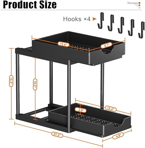 - 【سعة كبيرة وقابلة للتعديل】يبلغ مقاس التخزين تحت الحوض 15.7 انش طول × 8.5 انش عرض × 15.5 انش ارتفاع ويتميز بعرض درج قابل للتعديل (7.2 انش - 8.5 انش) وارتفاعات (2.1 انش - 2.4 انش) لاستيعاب الأشياء ذات الأحجام المختلفة. تتضمن أيضًا 4 خطافات جانبية وكوبين معلقين لمزيد من التخزين.