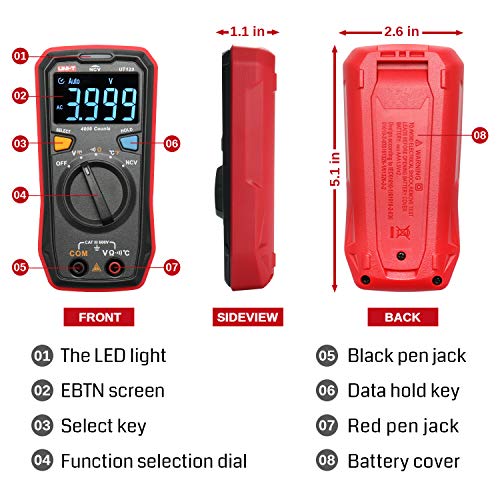 - محمول وذكي: مع شكل صغير، يتناسب هذا المقياس المتعدد بشكل مريح داخل جيبك أو يمكن حمله بسهولة بيد واحدة. من خلال زر "التثبيت" للحفاظ على القراءات في الوقت الفعلي. أيضًا، يتم إيقاف التشغيل تلقائيًا لأكثر من 15 دقيقة، واضغط على أي زر أو قم بتشغيل المفتاح تلقائيًا لتشغيله.