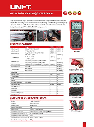 UNI-T - Uni-T +UT39A جهاز قياس التيار الكهربائي رقمي متعدد مع ميزات كاملة