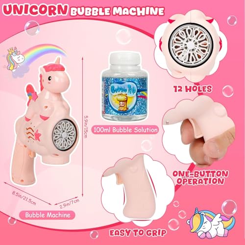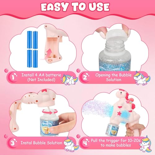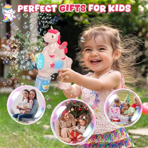 لعبة مسدس فقاعات على شكل يونيكورن للأطفال، مسدس الفقاعات الأوتوماتيكي مع محلول، فقاعات مضيئة، للأعمار من 3 سنوات فما فوق، بينك