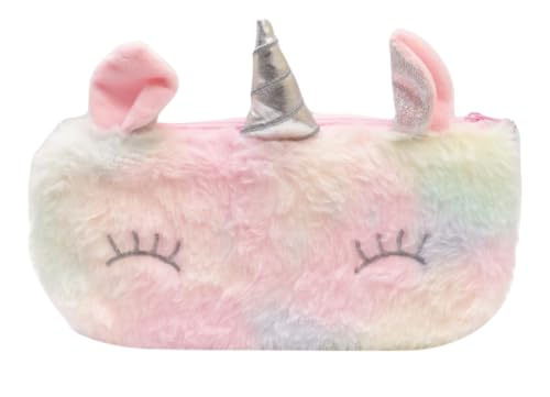 Generic - شنطة مستحضرات تجميل قطيفة بتصميم يونيكورن وفرو باستيل بالوان قوس قزح وقرن فضي وتصميم رموش