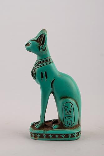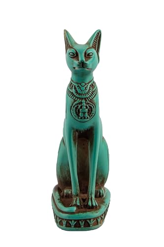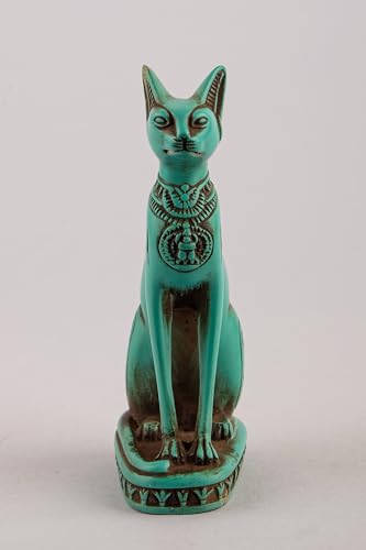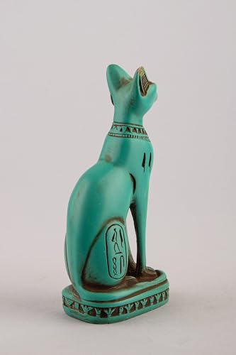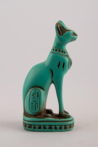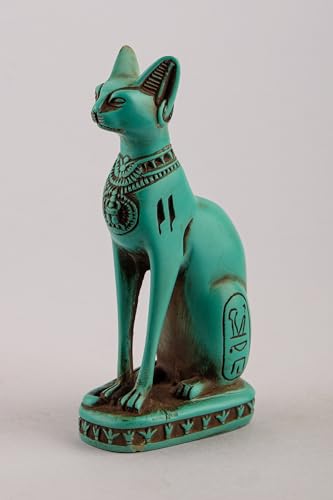 generic - تمثال قطة باستيت المصرية القديمة من الحجر الأخضر مع نقشة جعران على الصدر ورموز نقوش هيروغليفية حول القاعدة، صُنع في مصر