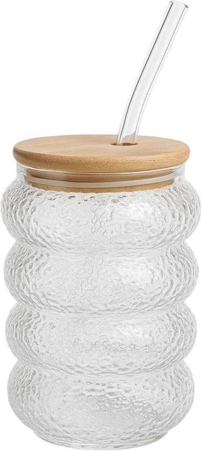 Generic - كوب زجاجي شفاف فريد مع غطاء خشبي وماصة زجاجية - للمشروبات الباردة (1)