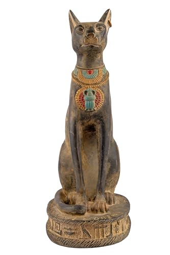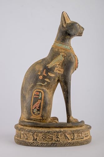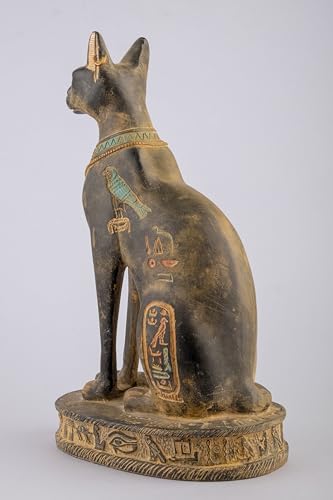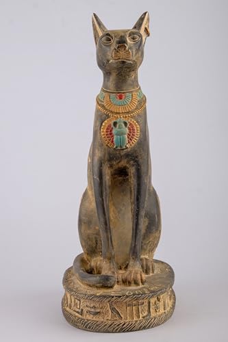 Generic - تمثال قط باستيت مصري مصنوع يدويا من الحجر الأسود مع جعران على صدرها، رموز نقوش هيروغليفية حول القاعدة، صنع في مصر