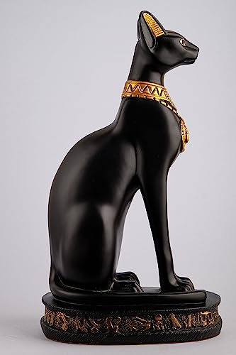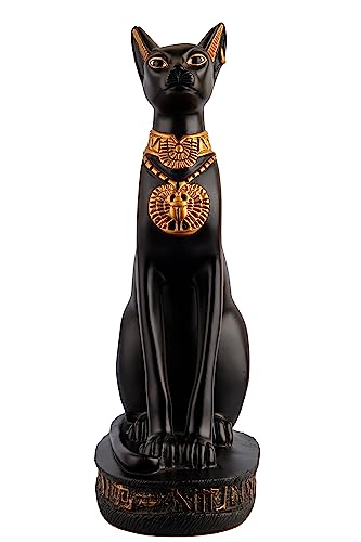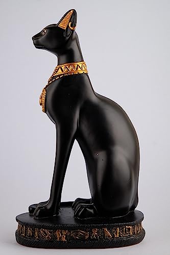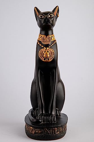 Generic - تمثال كبير للقطة باستت المميزة بطلاء أسود وذهبي مع تصميم جعران على الصدر ورموز نقوش هيروغليفية حول القاعدة، صنع في مصر