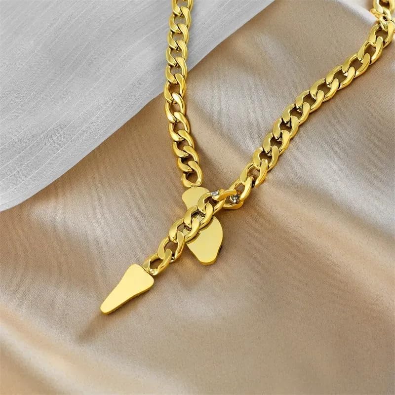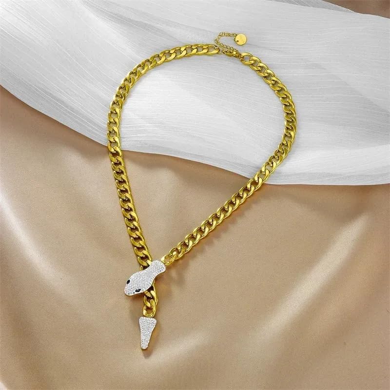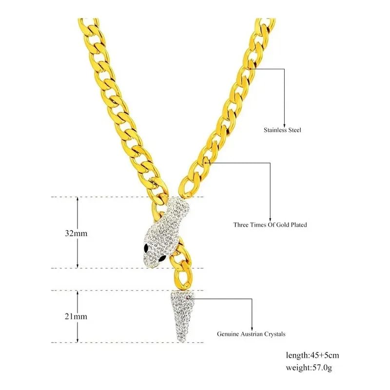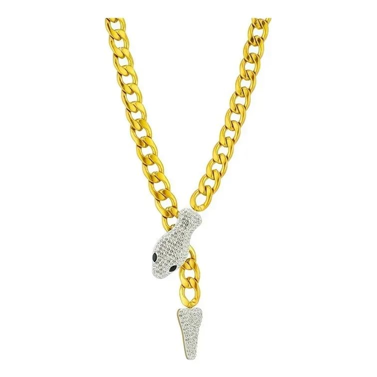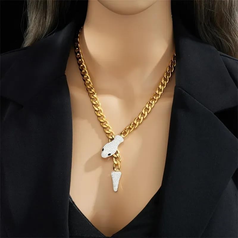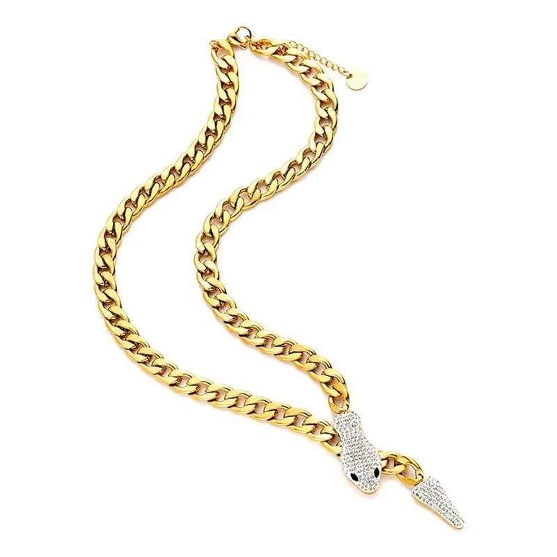 عام - قلادة نسائية (Unisex) بتصميم جريء، سلسلة كوبية سميكة (Cuban Link) مطلية بالذهب 3 مرات، دلاية أفعى متدلية مرصعة بكريستال نمساوي أصلي، مجوهرات هيب هوب/بانك فاخرة من الفولاذ المقاوم للصدأ.