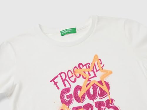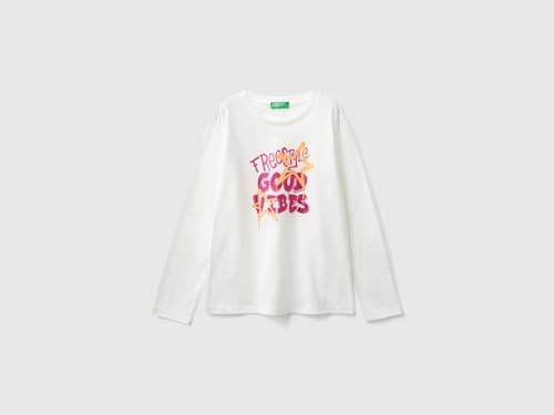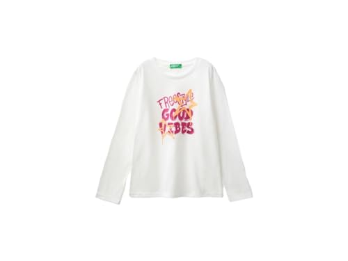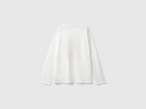 United Colors of Benetton - يونايتد كولرز اوف بينيتون تيشرت باكمام طويلة مطبوع للبنات بعمر 7-8 سنوات، ابيض