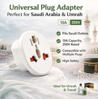 - التوافق العالمي: محول فيشة عالمي يدعم الأجهزة الأوروبية والأمريكية والآسيوية مع النظام الكهربائي السعودي ذو الثلاث شوكات