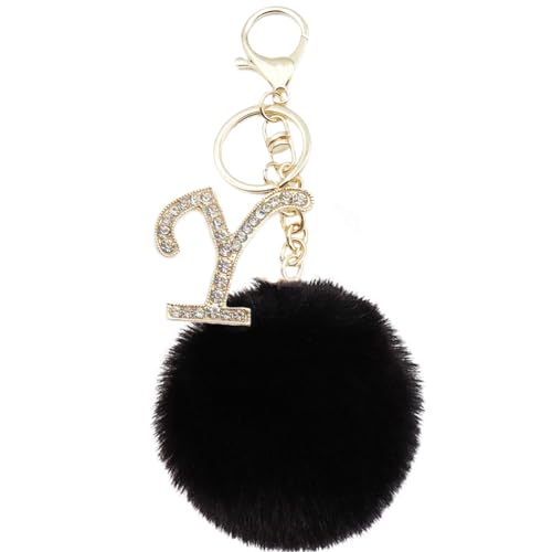 Unpafcxddyig - سلسلة مفاتيح بوم بوم سوداء مرصعة بحجر الراين الكريستالي والحروف الابجدية، حلقات مفاتيح لحقائب اليد في السيارة