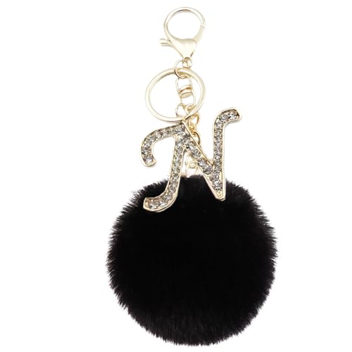 Unpafcxddyig - سلسلة مفاتيح بوم بوم من الفرو الصناعي مرصعة بحجر الراين الاسود على شكل حروف ابجدية للتعليق في السيارة