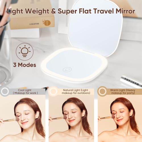- [3 أوضاع إضاءة وسطوع قابل للتعديل] المراية المحمولة الخاصة بنا مزودة بثلاثة أوضاع إضاءة مميزة: الضوء الأبيض والضوء الدافئ والضوء الطبيعي. يُسمح لك باختيار إعداد الإضاءة الأمثل لوضع المكياج الخاص بك أيًا كان العمل والحفلات والأمسيات.