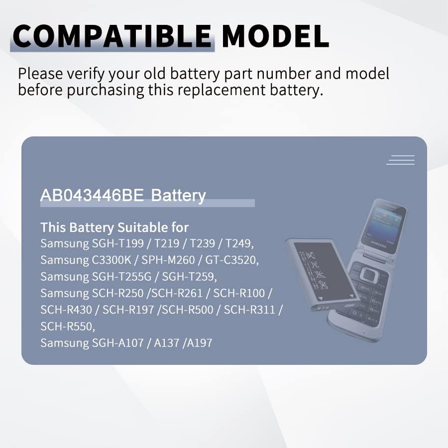 - الموديلات المتوافقة: مجموعة بطاريات بديلة لهاتف سامسونج SGH-T199 / T219 / T239 / T249/C3300K / SPH-M260 / GT-C3520/SGH-T255G / SGH-T259/SCH-R250 /SCH-R261 / SCH-R261 / SCH-R. 100 / SCH-R430 / SCH-R197 /SCH-R500 / SCH-R311 / SCH-R550/SGH-A107 / A137 / A197 (يرجى التحقق من رقم الموديل بعناية لتجنب الطلب الخاطئ).
