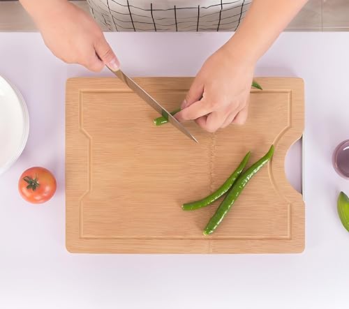 - تتضمن هذه المجموعة لوح تقطيع من الخيزران المتين والأنيق، بقياس 28 سم × 38 سم. يضيف التصميم العصري الخالي من الغرز لمسة من الرقي إلى مطبخك مع توفير مساحة واسعة لجميع احتياجاتك من التقطيع.