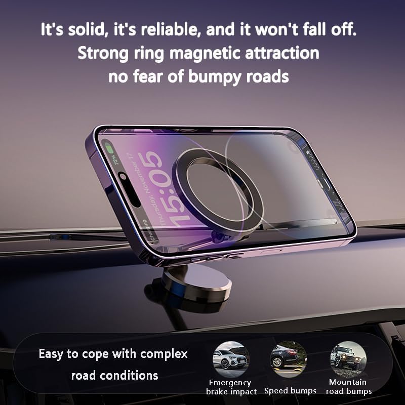 - ✅【تثبيت مغناطيسي قوي】تصميم مزود بمغناطيسات قوية، يلتصق بشكل محكم بموبايلك الآيفون، مما يمنع السقوط العرضي حتى على الطرق الوعرة، ويضمن دعمًا آمنًا للموبايل.