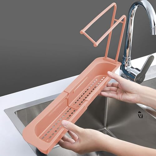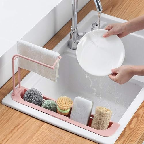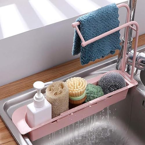 Spaceshoop - حامل سيليكون لحنفية الحوض من ابكارانوال، لتخزين الاسفنج وتصريف الصابون والماء قابل للتعديل، اكسسوارات حوض مطبخ بلون بينك