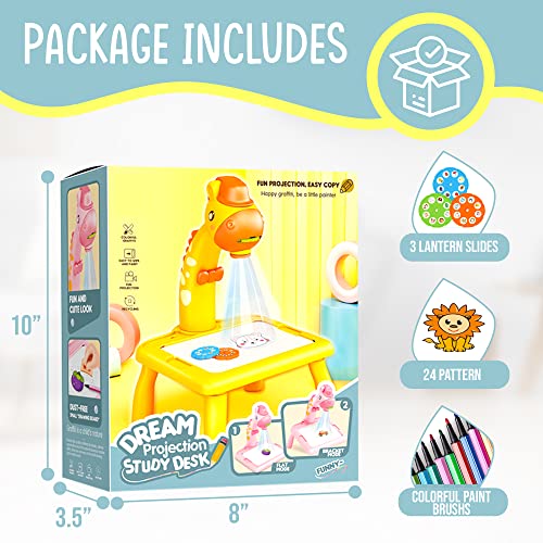 - فقط ما يحتاجه كل طفل - قم بإيقاف تشغيل الأضواء وتشغيل جهاز عرض الرسم وأدخل الشرائح المطبوعة مسبقًا وقم بوضع آثار الأقدام ثم قم بتلوين الصورة. يأتي مع 12 قلم رصاص ملون رائع للرسم وجهاز عرض عالي الجودة يتميز بزر دوار حتى تتمكن من اختيار الأنماط والحصول على تركيز أفضل.