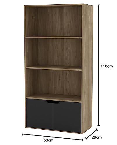 URBNLIVING - خزانة كتب خشبية عريضة من 4 طبقات مع بابين ورفوف تخزين ووحدة خشب البلوط ابواب سوداء .