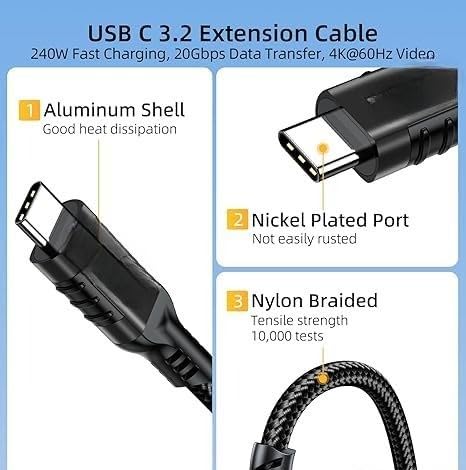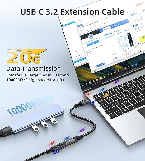 - نقل بيانات بسرعة عالية: يوفر كابل تمديد USB نوع C 3.2 سرعات نقل بيانات فائقة السرعة 20 جيجابايت في الثانية، مما يسمح لك بنقل الملفات الكبيرة والصور ومقاطع الفيديو في ثوانٍ.