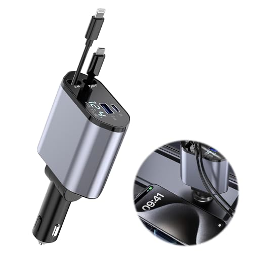kwinfei - شاحن سيارة USB نوع C بقوة 120 وات مع كابل قابل للسحب ومقبس بتقنية الشحن السريع بي دي، شاحن متعدد المنافذ وسريع الشحن في ولاعة السجائر، شاحن بملائمة شاملة متوافق مع مختلف العلامات التجارية للموبايلات