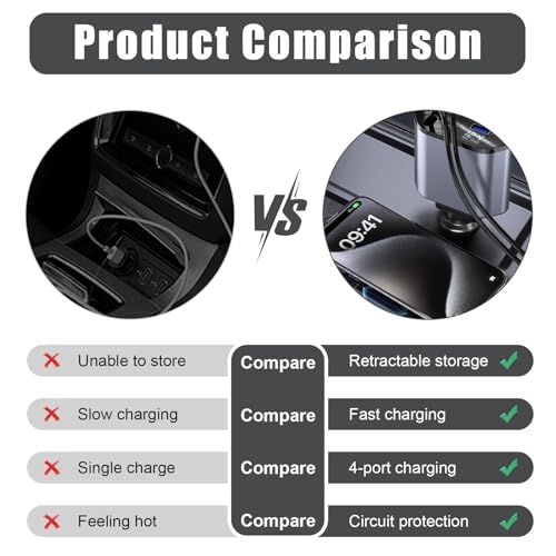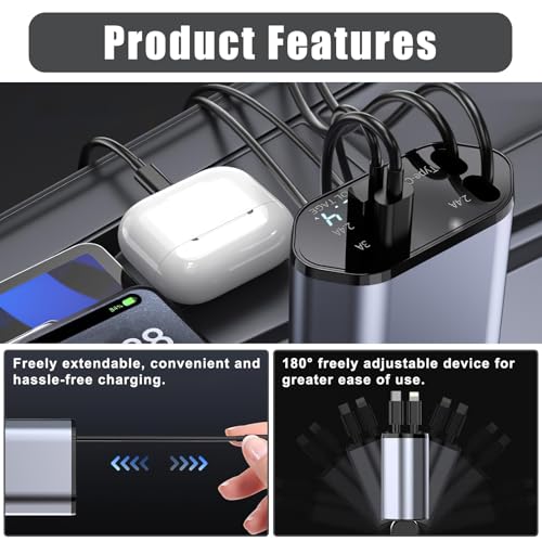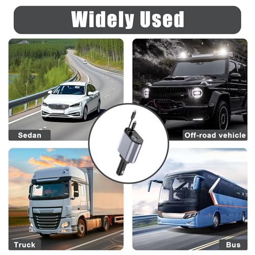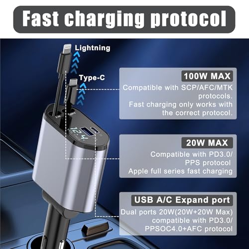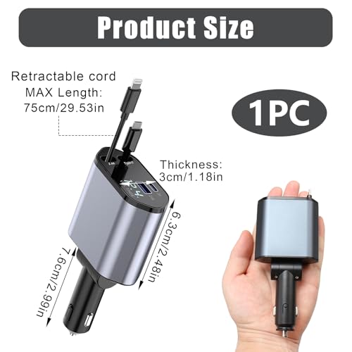 - شحن متعدد لجميع الركاب: مع شاحن السيارة بكابل USB نوع C قابل للسحب بتصميم 4 في 1، يمكنك تشغيل ما يصل إلى 4 أجهزة في وقت واحد. يتضمن منفذين USB (USB نوع A وUSB نوع C) ومنفذ USB نوع C وكابل قابل للتمدد بطول 90 سم.