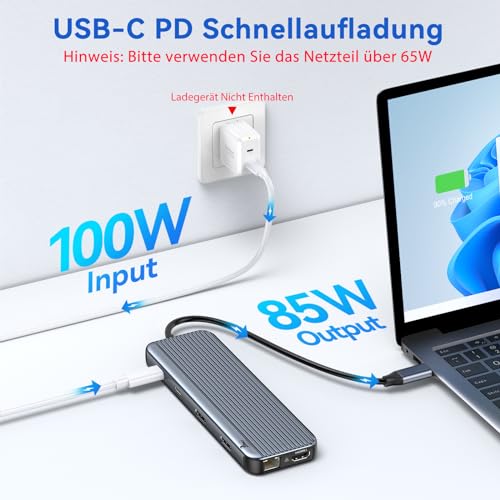 - جيجابت ايثرنت وبي دي 100 وات، الطاقة: قم بتوسيع اتصالك مع منفذ ايثرنت بسرعة 1000 ميجابت لكل ثانية في قاعدة توصيل USB C الخاصة بنا. تسمح لك قاعدة التوصيل بـ3 منافذ HDMI هذه بتصفح الإنترنت أو لعب الألعاب بشكل أسرع وأكثر استقرارًا. تدعم موزع USB C 3 أيضًا استهلاك طاقة يصل إلى 100 وات ومخرج طاقة يصل إلى 85 وات، لذلك يمكنك تشغيل أجهزتك أثناء الوصول إلى الوظائف الأخرى لهذا المحول متعدد المنافذ.