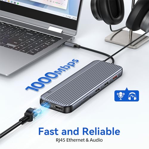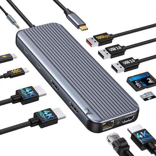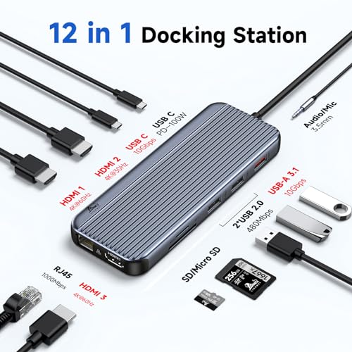 LIONWEI - قاعدة توصيل USB C بـ3 HDMI لـ3 شاشات 12 في 1، قاعدة شحن لاب توب ثلاثية العرض USB C 10 جيجابت في الثانية USB A/C 3.1، USB 2.0، بي دي 100 وات وايثرنت والصوت / الميكروفون لبطاقة SD / تي اف